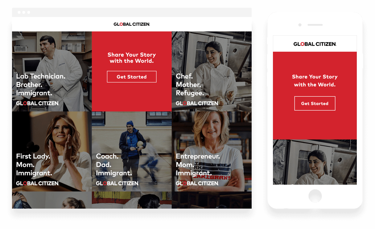 We designed and built a simple web application that allowed users to describe their connection to immigration in three short statements. Peoples’ statements were then overlayed over their photo with the the Global Citizen logo. Each post could then be shared through Facebook, Twitter and Instagram.